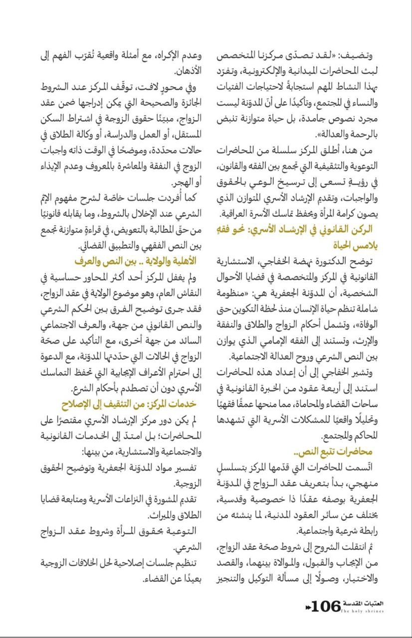 نشرت مجلة العتبات الصادرة عن إعلام العتبة الحسينية المقدسة في عددها السادس تقريرًا تناول مركز الإرشاد في النجف الأشرف وما يتميّز به من تفرد في شرح المدونة الجعفرية، مسلِّطًا الضوء على الجهود العلمية والإرشادية المبذولة في هذا المجال.
